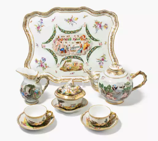Um 1900. Bezeichnet "N" unter Krone. Porzellan. Reliefdekor mit antiker Szenerie, polychrom staffiert. Goldfarbene Ornamentik, schwarz konturiert. Polychrome Blumenmalerei. Bestand: 1 Mokkakanne, 1 Crémier, 1 Zuckerschale, 1 Tablett, 2 Mokkatassen mit Untertassen (H 5 cm). Total 6 Teile.