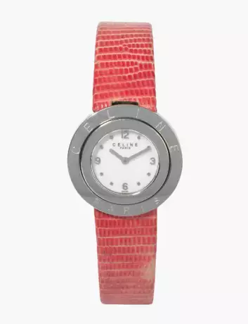 Edelstahl. Quarzwerk. Weisses Zifferblatt mit arabischen Zahlen. Steckverschluss. Pinkfarbenes Lederarmband. Batterie zu ersetzen. Mit Originalverpackung. H 4–6 cm.
