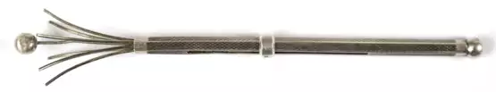 Los 739 | Champagnerquirl, Silber, hülsenartiger Korpus mit feinem Netzdekor, durch Schiebemechanismus 7 Quirlarme herausschiebbar, davon ist mittlerer mit Kugel besetzt, min. Gebrauchspuren, Ges.-Gew. ca. 5,5 g, L. 8,7 (13,7) cm…