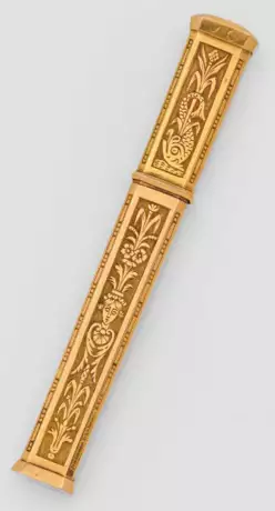 Gelbgold, 18 ct.; Rechteckiger, leicht konischer Korpus und Deckel mit gekanteten Ecken und abgesetzten Enden. Beidseitig in perlstabgesäumten Kartuschen vor fein punziertem Grund vegetabile Dekorelemente, Maskaronen und Fische. Minim. best.; Gest. Divisionsstempel 1819 -1838, Garantiestempel, unidentifiziertes Meisterzeichen. Gew. ca. 9,94 g. L. 8,4 cm.