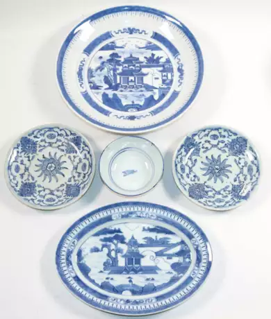 des 18./19. u. 20.Jh. Tlws. Blau weiß Bemalung. Schmetterlingsdekor u. Gebäude. Insges. 10 Tlg. 1 Teller der Qing Dyn. mit kl. Best.