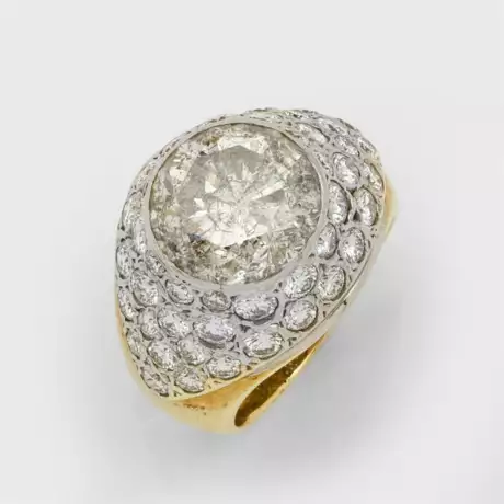 Gelb- und Weißgold, 18 k. Zentral besetzt mit einem hellgrauen Brillanten von ca. 5,08 ct. (p1), entouriert von Brillanten von zus. ca. 2,40 ct. (F-G/vsi). Gew. ca. 11,39 g.