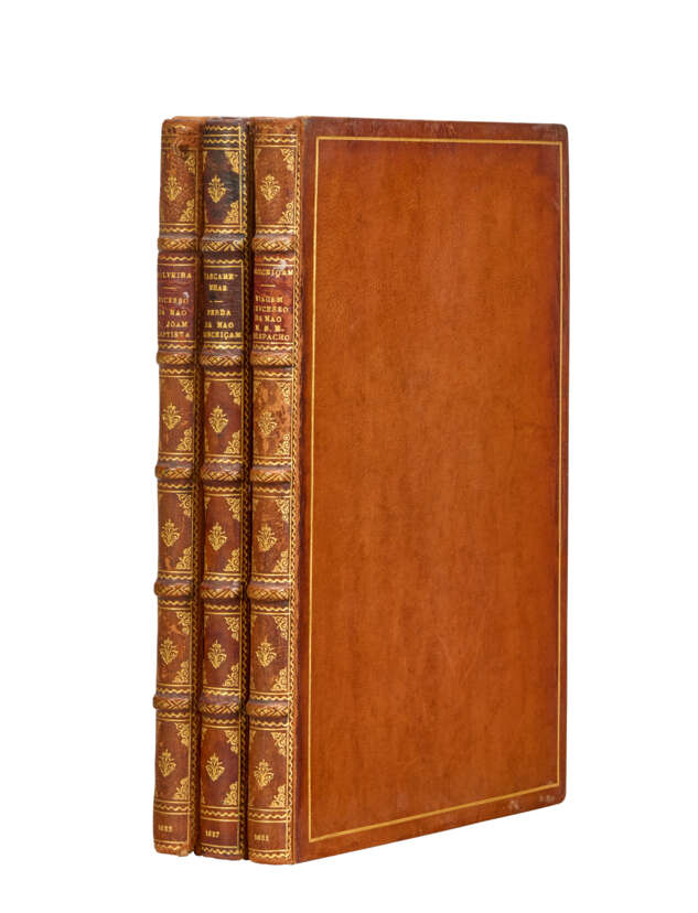 Three volumes, quarto (203 × 148mm). (Soiling, most leaves toned, occasional spotting.) Uniform modern gold-tooled brown calf by Frederico d’Almeida, spines lettered and tooled in gold, marbled endleaves (rubbed at extremities, joints cracking). Provenance: with O Mundo do Livro, Lisbon – José Mindlin, 1914-2010 (bookplates).