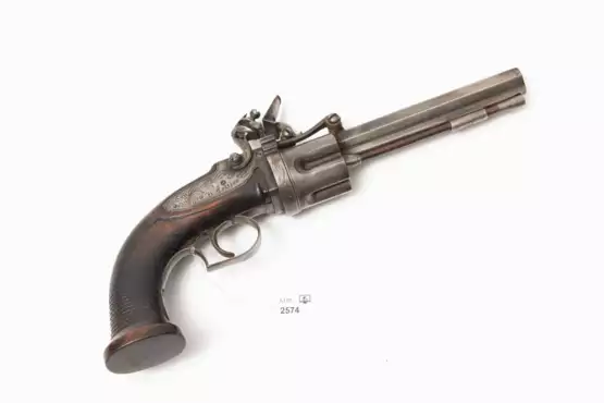 London, im Stil um 1820, 2. Modell, wohl Replik. Oktogonallauf (L 13,2 cm), Kal. 8 mm, Brünierung leicht berieben. Laufoberseite sign. "E.H. Collier London". Brünierte Schlossplatte und Hahn flach mit floralen Gravuren und Signatur "E.H. Collier 14 PATENT", fünfschüssige Trommel. Schlossgang funktionstüchtig, jedoch Trommel lässt sich nicht drehen. Brünierte Eisengarnitur. Dunkler Nussbaumschaft mit rautengewaffeltem Griffstück. Letzteres mit wohl künstlich hergestelltem Abrieb, um ausführlichem Gebrauch vorzutäuschen. Holzladestock mit Eisendopper. L 32 cm.