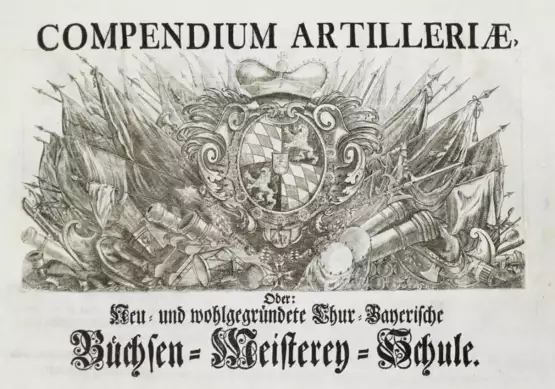 VD18 14426781. - Seltenes bayerisches Lehrbuch der Artillerie, laut Titelzusatz "aus eigner Erfahrung, als vielen berühmten Autorn, um so mehr, als ohnedem die meiste dergleichen nicht beyzuschaffen im Stand seyen, als auch zu mehr, und leichterer Ausübung deren noch in der Lehr begriffenen Scholaren, mit vielen, und deutlichen Kupffer-Stücken, und wohl verfaßten Erklärung aufgesetzt, und zusammen getragen worden." - Text kaum braunfleckig, Tafeln wasserrandig und tls. etw. gebräunt, Ebd. etw. berieben u. fleckig.
