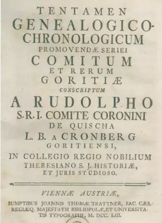 Wurzbach III, 12 - Coreth 164 - Giese 60 - Valentinelli, 209 - Combi 1099 - Manzano 68.- Titelauflage der 1752 erschienenen Erstausgabe. - Frühestes und bedeutendstes Werk des Görzer Geschichtsforschers. - Titel mit Monogr.-Stempel, braunfleckig, 1 Tab. mit Einriss, Ebd. tls. etw. berieben.