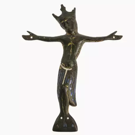 Viernageltypus, mit nach rechts geneigtem Kopf und angewinkeltem linken Bein in leichtem S-Schwung stehend. Bronze, mit Resten von Vergoldung und polychromen Email. Auf Tafel montiert. H. Corpus 19 cm.