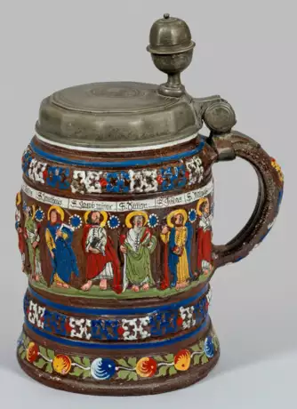 Dunkelbraunes, salzglasiertes Steinzeug mit polychromer Emailbemalung. Auf der Wandung breiter Fries mit aufgelegten, namentlich bez. Reliefdarstellungen der zwölf Apostel und von Christus als Salvator. Ohrenhenkel belegt mit reliefiertem Maskaron und Akanthusblatt. Zinnmontierung, der Deckel mit Kugeldrücker. Minim. best.; Ges.-H. 23 cm.