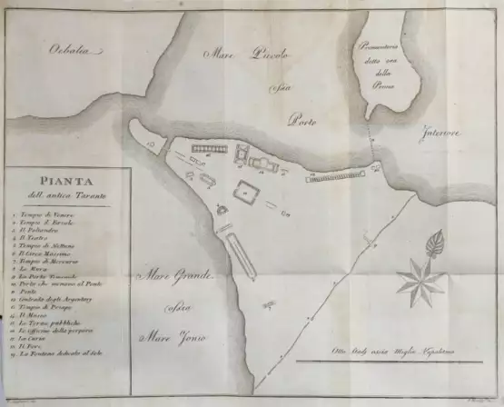 Gamba 2578 Anm. Parenti VI, S. 365. Seltene erste Ausgabe des Briefromans. - Die Karte zeigt einen Plan des antiken Taranto. Vincenco C. (1770-1823) beschreibt eine phantastische, uralte Zivilisation, die in Italien vor der griechischen Kolonisation während der Magna Graecia erblühte und als Anregung für eine geistig-seelische Wiedergeburt Italiens dienen sollte, die aus eigenen Traditionen entspringen soll und nicht aus fremden Einflüssen. Mit diesem Buch übte Cuoco bedeutenden Einfluß während des Risorgimento aus. - Bde. 1-2 anonym ersch., Bd. 3 nennt C. als Übers. aus dem Griech. (fingiert). - Etw. wasserrandig, Vors. erneuert, Bd. 1 mit hs. Besitzverm. a.T.