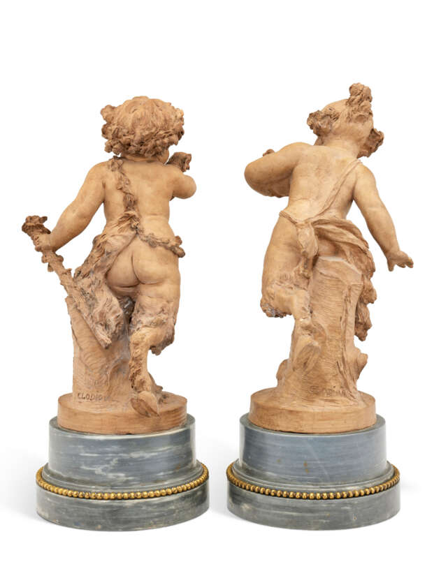 deux terres cuites formant paire, portant les signatures 'CLODION' dont une au N inversé, sur des bases en marbre bleu turquin et bronze doré ; accidents