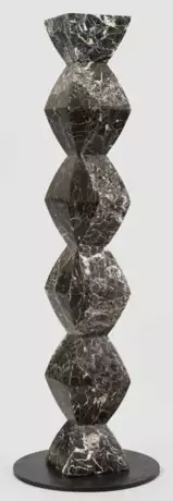 Schwarzer, hell geäderter Marmor. Auf runder Plinthe aus mehreren gleichmäßig übereinander stehenden, vertikal abgerundeten Vierecken gestaltete Säule mit glattem, rechteckigen Abschluss. H. 92 cm.