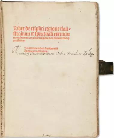 First and only incunable edition, bound at the Benedictine monastery at Ammensleben. The polymath Benedictine monk Trithemius wrote De triplici regione claustralium as a guide for novice monks—detailing meditations, daily routines and other spiritual practices to facilitate their integration into monastic life. Appended to the work is his Compendium quotidiani spiritualis exercitii, a similarly instructional text compiling short prayers. Fittingly, the present copy was first owned by a Benedictine house. In the present copy, one monk has written a prayer that he may observe a monastic life without falling prey to the devil’s temptations: “Jesus Maria Joseph Benedictig scholastica, adsint mihi, in Vita monastica ne diabolg in vitia, sua me trahat versutia. Amen. Hoc est fiat mihi & tibi.” HC 15618*; BSB-Ink T-463; Bod-inc T-251; BMC I 49; CIBN T-329; GW M47570; Goff T-456; ISTC it00456000.
