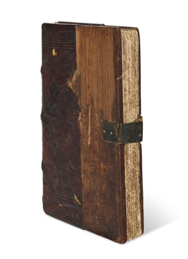 Chancery quarto (195 × 140mm). 98 leaves (points as in GW M47570 Amn.1). Six-line title in red, red initials and rubricated throughout (stain in margin of c6, soiling, dampstains mostly in final quires, few small marginal tears). Contemporary German half-calf over vellum on wood boards, bound at the Benedictine monastery at Ammensleben [EBDB w002315], tooled in blind with a stamp that reads “am[m]e[n]sleue”, lions, flowers, a celestial crown and a fleur-de-lys [s001005, s002871, s004455, s015340, s015341, s015343, s031597] within double-filleted panels, fore-edge clasp, recycled manuscript pastedowns, red leather index tabs (vellum remaining only on part of upper board, some loss to calf on upper board from abrasion and worming, cracks at spine, rubbed); modern cloth slipcase. Provenance: Benedictine Monastery at Ammensleben (binding; 17th-century inscriptions on title-page and flyleaves) – Staatsbibliothek zu Berlin ("Preußische Staatsbibliothek, Berlin" accession and deaccession stamps) – [Phyllis Goodhart Gordan (1913–1994); by descent.]