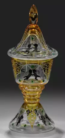 Glockenfuß in vierfach gegliederten Schaft einschwingend, halbkugelige Kuppa, hochgezogener Deckel mit Pinienknauf. Facettiert. Farbloses Glas, geschliffen, teilw. gelb gebeizt. Stilisierter floraler und ornamentaler Dekor mit tanzenden Engeln in schwarzer Malerei, Gold und Mattsalz. Entw. wohl Adolf Beckert. H. 25,5 cm.
