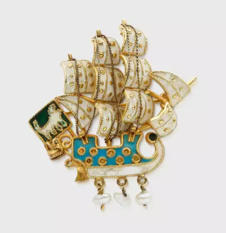 Gelbgold, gest. 18 k, teilw. polychrom emailliert. Plastisch gestalteter Drei-Master mit drei Biwa-Perlen, umzogen von Millegriffbändern. Gew. ca. 13,20 g.