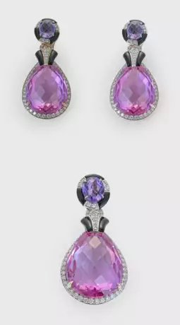 Ohrclips mit korrespondierendem Anhänger. Roségold, gest. 18 k. Zentral besetzt mit pinkfarbenen, synthetischen Saphiren und fliederfarbenen Amethysten im Briolettschliff, entouriert von kleinen Brillanten von zus. ca. 1,70 ct.; Ges.-Gew. ca. 38,00 g.