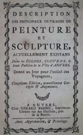 Seltene fünfte korrigierte und erweiterte Ausgabe dieses Kunstinventars der Antwerpener Gemälde und Skulpturen. Die vierte Auflage wurde 1774 veröffentlicht, die fünfte und sechste Auflage sind nicht datiert. Im Anhang mit stichworthafter Auflistung einiger lokaler Privatsammlungen. - Bindung tls. gelockert, Titel mit kl. Brandloch, stellenweise etw. Randläsuren.