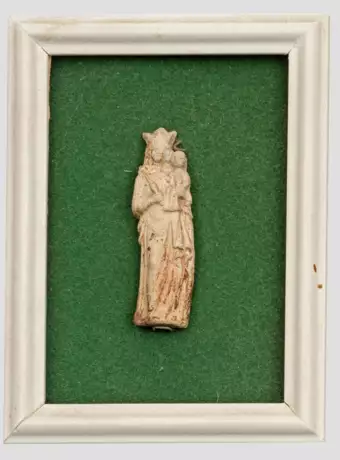 Ton, halbplastisch gearbeitet und hell gefasst. Rückseitig abgeflacht. Aufrecht stehende, gekrönte Maria in bodenlangem Gewand, das Christuskind an ihrer rechten Seite tragend. Wohl als Pilgerandenken oder Schabmadonna gefertigt. H. 5,5 cm. Rahmen erg.; 8,5 cm x 11,5 cm.