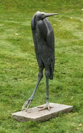 German animal sculptor active 20th century. Patinated bronze heron as garden sculpture.