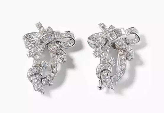 1940er Jahre. 750 Weissgold. Zwei elegante Dressclips als Schleifen gestaltet, mit zahlreichen, feinen Brillanten von ca. 0.48 ct, und pavégefassten Achtkant-Diamanten und Diamant-Baguetten von zus. ca. 0.35 ct H/I-vs/si. Mit Doppelnadel-Broschierungen. L 2,5 cm, 15 g.