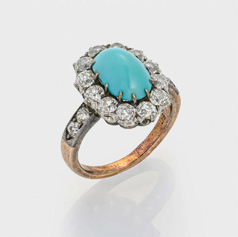 Roségold, gest. 750. Zentral besetzt mit einem Türkiscabochon, entouriert von Diamantrosen von zus. ca. 1,10 ct.; Gew. ca. 4,70 g.