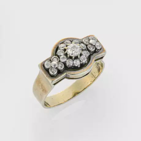 Gelbgold, gest. 585. Geometrisch gestalteter Ringkopf, schauseitig besetzt mit Altschliffdiamanten von zus. ca. 0,50 ct.; Gew. ca. 5,71 g.