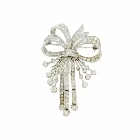 Description: Elegant platinum brooch designed as a bow brooch, entirely set with diamonds. The three