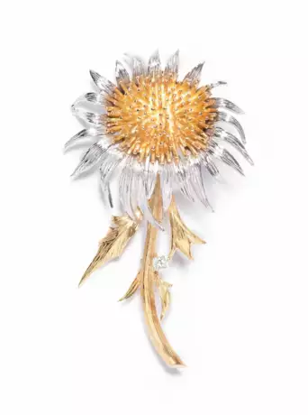 750 Weiss-/Gelbgold. Darstellung einer stilisierten Distel mit einem Brillanten. L 6 cm, 16 g.