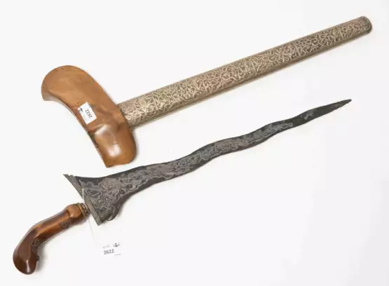 Indonesien, Zentraljava, Surakarta, 20. Jh. Honigfarben melierter Holzgriff mit vergoldeter Buntmetallzwinge, dieselbe mit 10 Schmucksteinen besetzt. Geflammte, stark gemusterte und parfümierte Pamorklinge (L 36 cm) mit fünf Luk . Holzscheide mit floral und figürlich punziertem Neusilberblech verkleidet. L 46,5 cm.