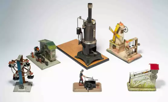 (1) Dampfmaschine. Nürnberg, um 1920/30. Firmensignet "DC". Blech, Eisen und Messing brüniert. Stehender Dampfkessel mit Kamin, Zylinder und Schwungrad auf handlackiertem Gusssockel. Mit Brenner. Auf Holz imitierende Blech-Plattform montiert. 30,5x16x33,5 cm. (2) 5 Antriebsmodelle assortiert. Windmühle, Mühle, Bergbahn, russische Schaukel und Stahlarbeiter. Diverse deutsche Hersteller, 1930er/50er Jahre. H 9,5–19,5 cm.
