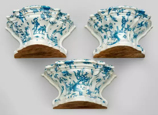 A set of three blue and white Baroque faience wall brackets. Minor chipped.