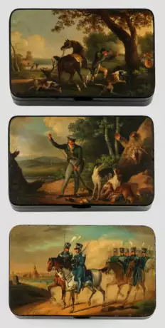 Weißblech, dunkel lackiert. Rechteckig mit gerundeten Ecken und Scharnierdeckel. Deckel mit Jägern und Hunden bzw. berittenen Soldaten in polychromer Lackmalerei. Innen in Gold lackiert und einmal bez. "Landswehr Nürnber ". Zeltner. 1833.“ Ber.; H. 2,5 cm. 13,5 cm x 8,5 cm.