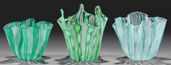 Three Italian Murano "Fazzoletto" glass vases. Partly probably designed for Venini, 1950-1955. Unmarked.