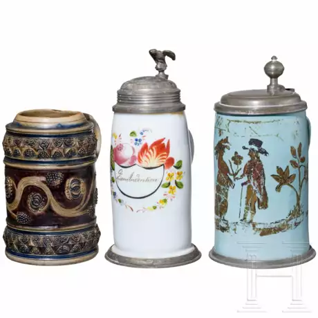Ein Milchglaskrug mit Zinnmontur. Front mit Kartusche "Zum Andenken", Zinndeckel mit Adlerdrücker. Wandung mit Haarrissen. Höhe 25,5 cm. Ein Fayencekrug mit Goldmalerei und Zinnmontur, Wandung beschädigt. Höhe 24,5 cm. Ein Westerwälder Steinzeugkrug mit stilisiertem Floraldekor. Zwei Haarrisse. Höhe 17,5 cm.