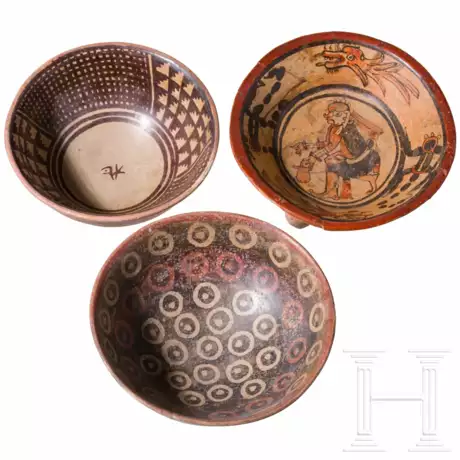 Ton. Zwei mit rundem Standring, eine auf drei langgezogenen Füßen. Spiegel und Fahne polychrom bemalt: zwei mit geometischem Muster, eine mit stilisierter männlicher Figur und Fabelwesen. Eine Schale intakt, eine mit Haarriss und bestoßenem Fuß, die dreibeinige Schale restauriert. Durchmesser 17,6 - 19 cm. Falls nicht in der Beschreibung anders erwähnt, erfolgt die Altersbestimmung aufgrund der Charakteristika des Objekts, ohne ein TL-Gutachten angefertigt zu haben.