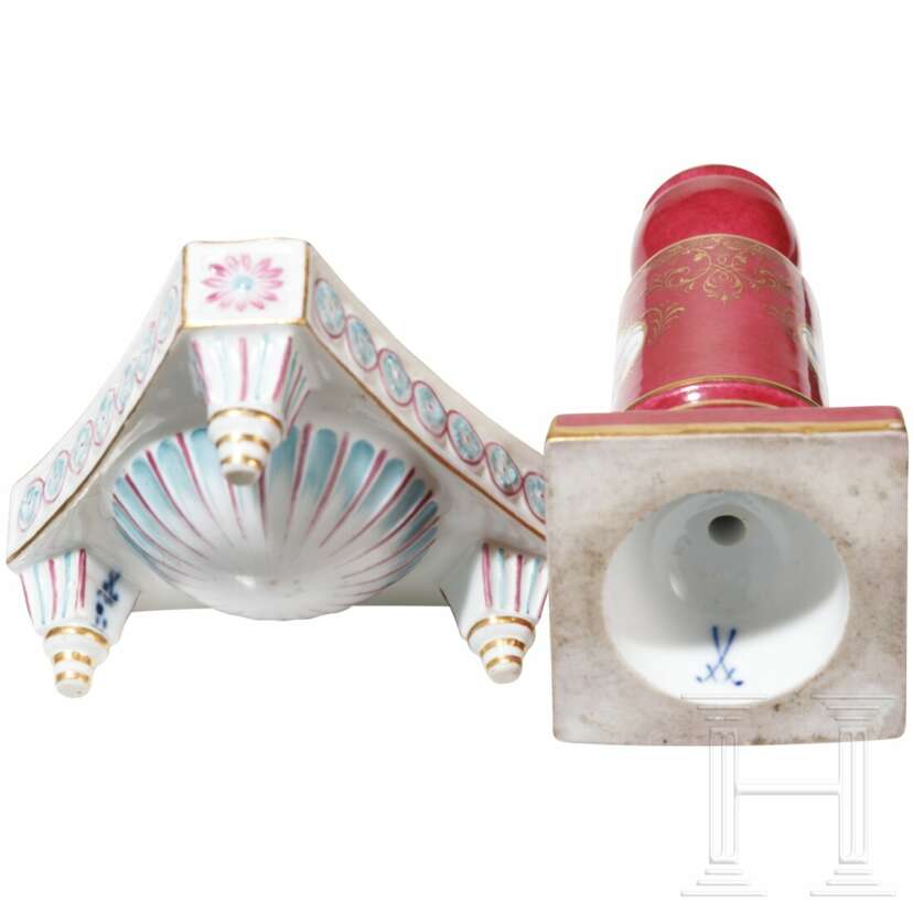 Porzellan. Dreikantige Saliere auf drei Beinen. Im Spiegel feiner Blumendekor. Die Kanten jeweils mit drei Liebespaaren. Ein Fuß mit Schwertermarke mit Stern und einem Schleifstrich. Maße 9,6 x 8,7 cm. Außerdem ein Leuchter auf quadratischem Stand. Roter Fond, partiell vergoldet. Schaft mit zwei goldgerahmten Kartuschen mit bunten Blumenbouquets. Unterseite mit Knaufmarke, 1. Wahl. Gold leicht berieben. Stand mit minimalen Abplatzern, übermalt. Höhe 14 cm.