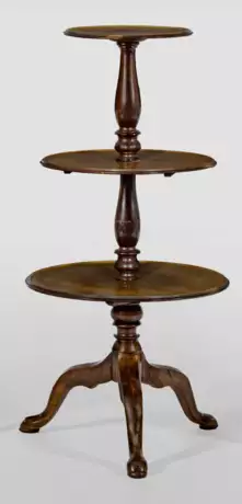 Mahagoni. Mehrfach gegliederter Balusterschaft auf stark geschwungenen Beinen als Träger für runde, gestaffelt angeordnete und umlaufend profilierte Abstellflächen. H. 112 cm.