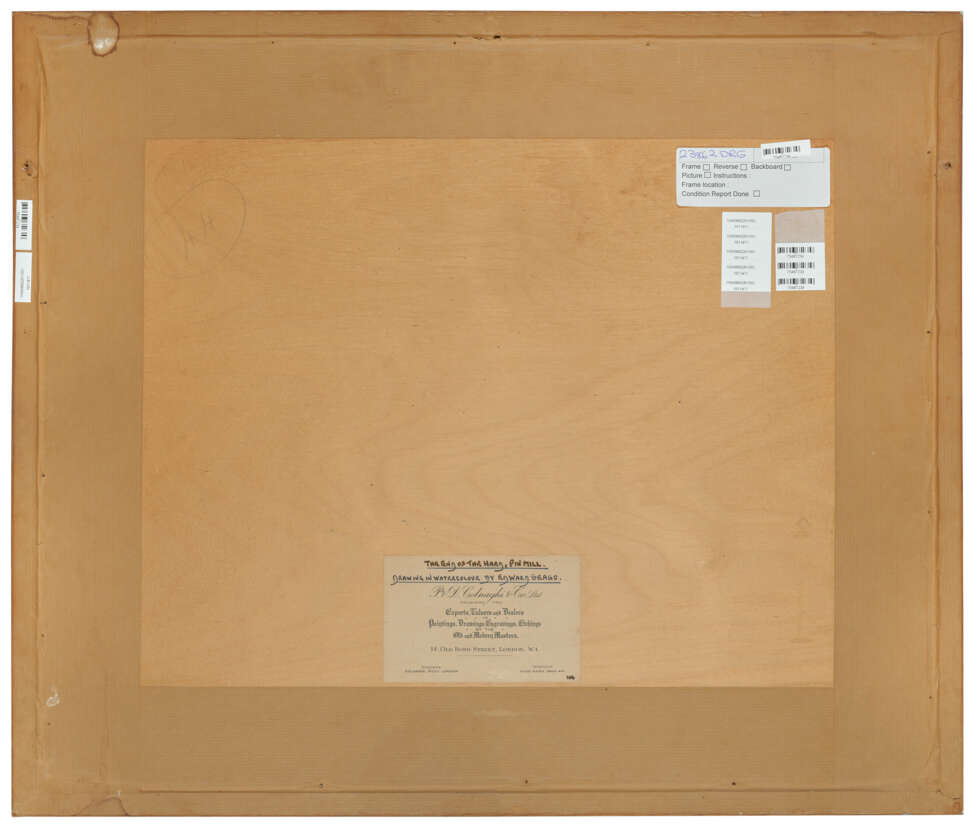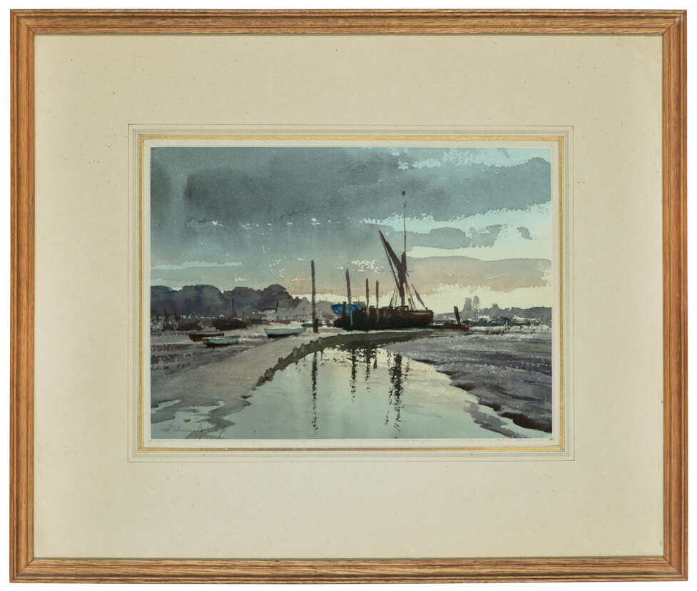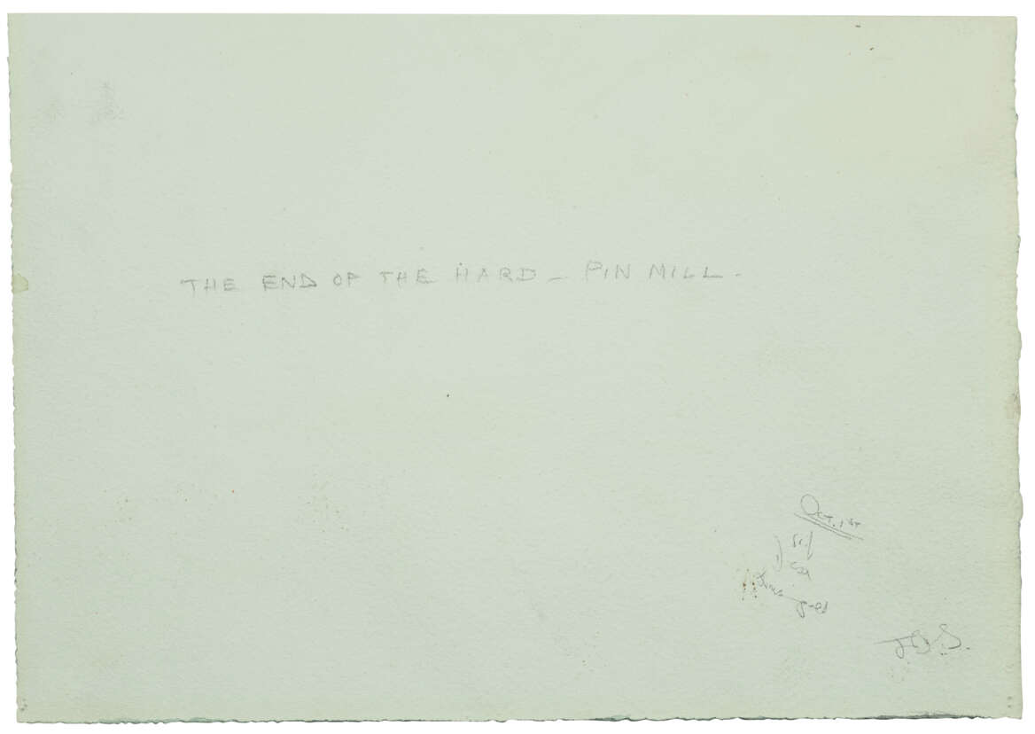 signed 'Edward Seago' (lower left) and inscribed with title 'THE END OF THE HARD - PIN MILL.' (verso)