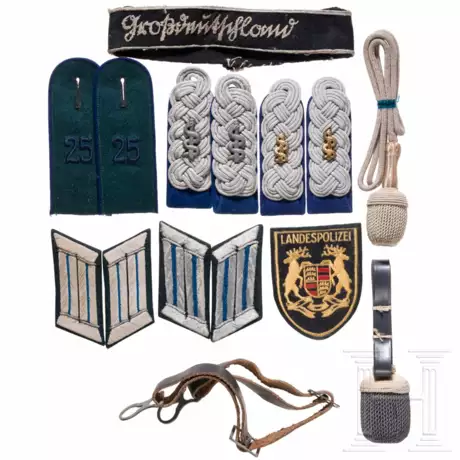 Ärmelband "Großdeutschland" in Offiziersausführung aus feinem schwarzen Abzeichentuch mit silbern gesticktem Namenszug in Sütterlinschrift. Sichtlich getragenes, von der Uniform abgetrenntes Band mit ca. 38 cm Länge, der rs. Teil der Silberlitze fehlt. Zwei Paar Schulterstücke zum Einnähen und zwei Paar Kragenspiegel, ein Paar Schulterklappen für Mannschaften, ein Dolchportepee und ein Faustriemen. Dazu ein Ärmelabzeichen und ein Kinnriemen der württembergischen Landespolizei der Nachkriegszeit.