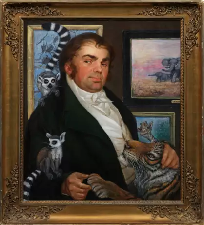 Neben seinen naturalistischen Tierstücken bilden Übermalungen ein weiteres, bedeutendes Thema und Kunstmittel im Oeuvre Redels. Bei diesem Werk überarbeitet er ein traditionelles Biedermeier-Porträt eines Herren in zeittypischer, europäischer Mode, indem er im Hintergrund eine Gemäldegalerie mit Tierstücken ergänzt und dem Porträtierten zwei Lemuren und einen Tiger, der wie ein zutraulicher Schoßhund gestreichelt wird, als vertraute Begleiter zur Seite stellt. Durch die neuzeitliche Überarbeitung erhält das ursprüngliche Bildnis einen neuen Kontext und somit eine Umdeutung. Öl/Lwd; R. u. monogr. und dat. 2025. Verso auf einem neuzeitlichen Etikett betitelt. 81,5 cm x 66,5 cm. Rahmen.