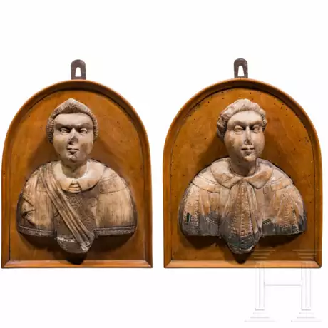 Im Hochrelief aus Alabaster geschnittene männliche Büsten. Beide in vornehmer Renaissance-Tracht und jeweils mit Lorbeerkranz bekrönt. Geringe Reste von Bemalung, stellenweise bestoßen bzw. in Stuck ergänzt. Jeweils auf eine (leicht wurmstichige) Holztafel mit rs. Öse montiert. Maße 32 x 25 cm bzw. 32 x 26,5 cm.