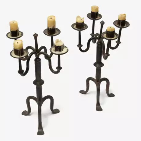 19./20.Jh. Schmiedeisen. Kräftiger Schaft auf drei Füssen. Vier geschweifte Leuchterarme mit Tropftellern. Höhe je 53 cm.