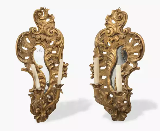 19.Jh., Rokokostil. Holz geschnitzt und auf rotem Poliment vergoldet. Kleine Spiegeleinsätze. Zwei geschweifte Leuchterarme. 17 x 36 cm, Höhe 77 cm.