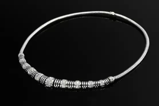 Elegantes Art Deco Weißgold 585 Collier am Spiralhalsband mit 28 Brillanten und 16 Achtkantdiamanten (zus. ca. 2.68ct/VVSI-VSI/TW-W), 27,8g, L. 43cm