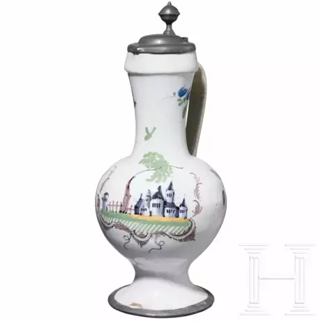 Fayence. Standring aus Zinn. Balusterförmige Wandung mit langgezogenem Hals. Schauseite mit bunt gemalter Architekturansicht sowie Blütenwerk. Bandhenkel und Fuß restauriert. Höhe 38 cm.