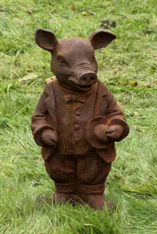 Gusseisen mit rotbrauner Rostpatina. Anthropomorphe Figur eines Schweins mit Anzug und Weste, das seinen Hut in einer Klaue hält. H. ca. 45 cm.