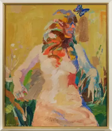 Kraftvoll-impulsive Komposition in allen Farben des Regenbogens, aufgetragen mit breitem, flüchtigen Pinselduktus. Über einer auf einem Armlehnstuhl platzierten nackten Frau mit braunen Haaren fliegt ein blau-roter Schmetterling empor. Das Motiv erinnert an die antike Mythologie der Nymphe Psyche, die sich wie eine Raupe in einen Schmetterling verwandelte und als menschliche Seele Unvergänglichkeit erlangte. Der erst kürzlich in seiner Heimatstadt, hochbetagt verstorbene Pöldros zählt zu den nonkonformen Künstlern Estlands, der sich dem aufoktroyierten sozialistischen Realismus immer wieder entzog und eigene künstlerische Wege beschritt. Bekanntheit erlangte er 1993 mit seinen Wandbildern in der Nationalbibliothek Estlands. Im Frühjahr 2025 fand eine Retrospektive auf Enn Pöldros künstlerisches Schaffen im Kunstmuseum Kumu statt. Öl/Lwd.; L.u. Sign. u. datiert (19)83; zudem verso betitelt, sign. und datiert. 90 cm x 75 cm. Rahmen.