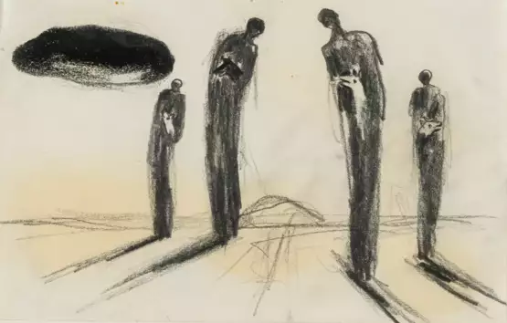 Linke Kante vom Künstler unregelmäßig gerissen. Mit drei winzigen Nadellöchlein mittig am oberen Rand, Fixativ stellenweise etwas nachgedunkelt, sonst gut.