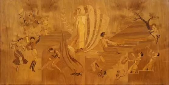 In verschiedenen Hölzern eingelegte Marketerie mit Darstellung einer spanischen Musikgruppe mit Tänzern, Musikern und einer Sängerin. Nach einem Entwurf des bekannten dänischen Designers Erik Matsson. 47,5 cm x 92,5 cm.