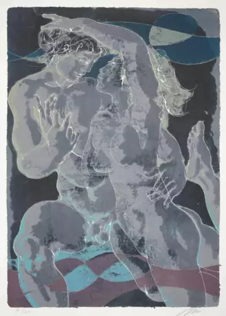 Eines von 480 num. Ex. (GA 570), vom Künstler und Verleger im Impressum sign. - Giroud 60. - Die ,Lithographie hs. num. (1 von 160 Ex.) und signiert, aus der Serie "Tanzen". Vorliegendes Werk erschien zum 65. Geburtstag des Künstlers und bietet einen Querschnitt aus seinem Oeuvre. Es enthält: 5 Original-Lithographien im Stein signiert, 1 Abzug in Zinkätzung, 1 Komposition mit Prägung, 1 Reliefprägung, 57 Faksimilewiedergaben."